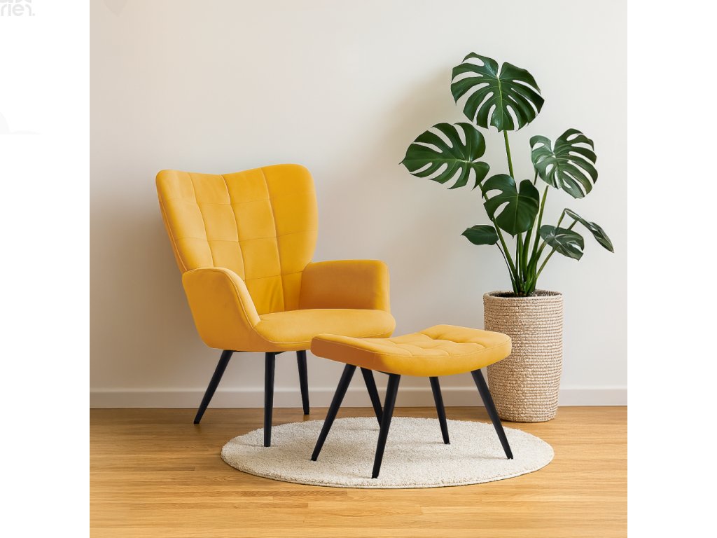 Čalouněné křeslo s taburetem BARON – žlutá Velvet látka