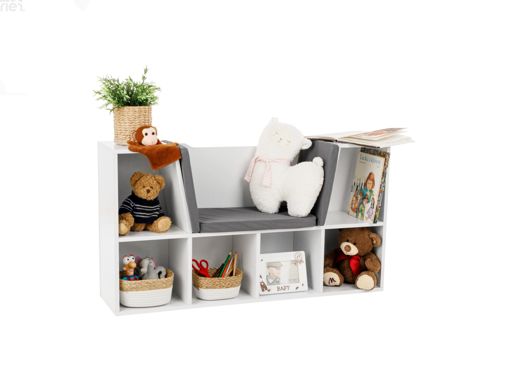 Dětská knihovna s místem k sezení, bílá / hnědá, FERIA