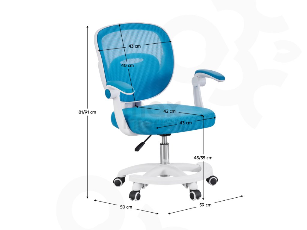 Rozměry: 59x50x81-91 cm, výška sedu nastavitelná 45–55 cm, hloubka sedu 42 cm, šířka sedu 43 cm