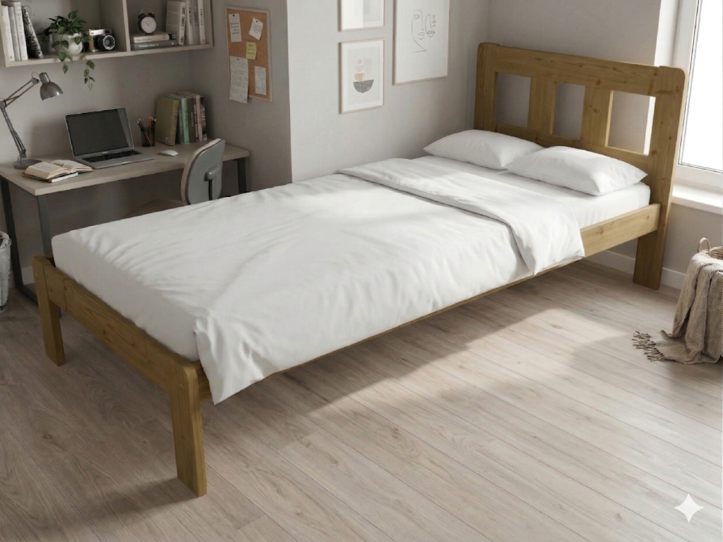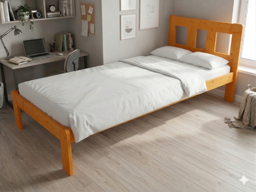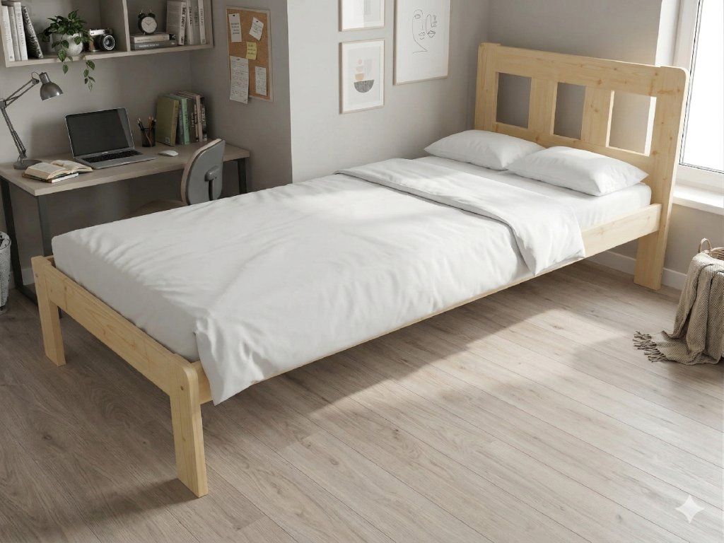 Dřevěná postel 100x200 cm z masivní borovice – VMK10A nabízí pevnost, komfort a přírodní eleganci. Je ideální pro menší ložnice, studentské pokoje nebo hostinské místnosti, kde je důležitá stabilita a dlouhá životnost. Postel je dodávána včetně laťového roštu