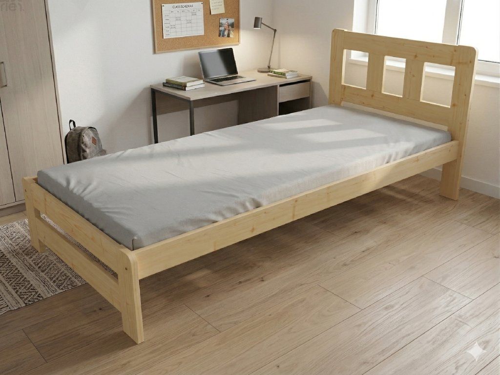 Dřevěná postel 100x200 cm z masivní borovice – VMK10B nabízí pevnost, komfort a přírodní eleganci. Je ideální pro menší ložnice, studentské pokoje nebo hostinské místnosti, kde je důležitá stabilita a dlouhá životnost. Postel je dodávána včetně laťového roštu