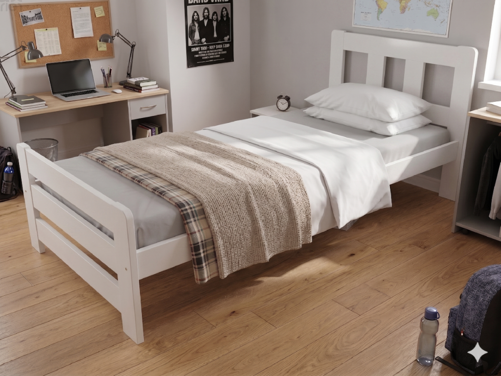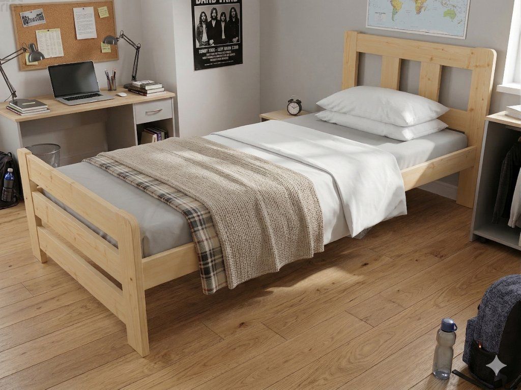 Dřevěná postel 100x200 cm z masivní borovice – VMK10D nabízí pevnost, komfort a přírodní eleganci. Je ideální pro menší ložnice, studentské pokoje nebo hostinské místnosti, kde je důležitá stabilita a dlouhá životnost. Postel je dodávána včetně laťového roštu