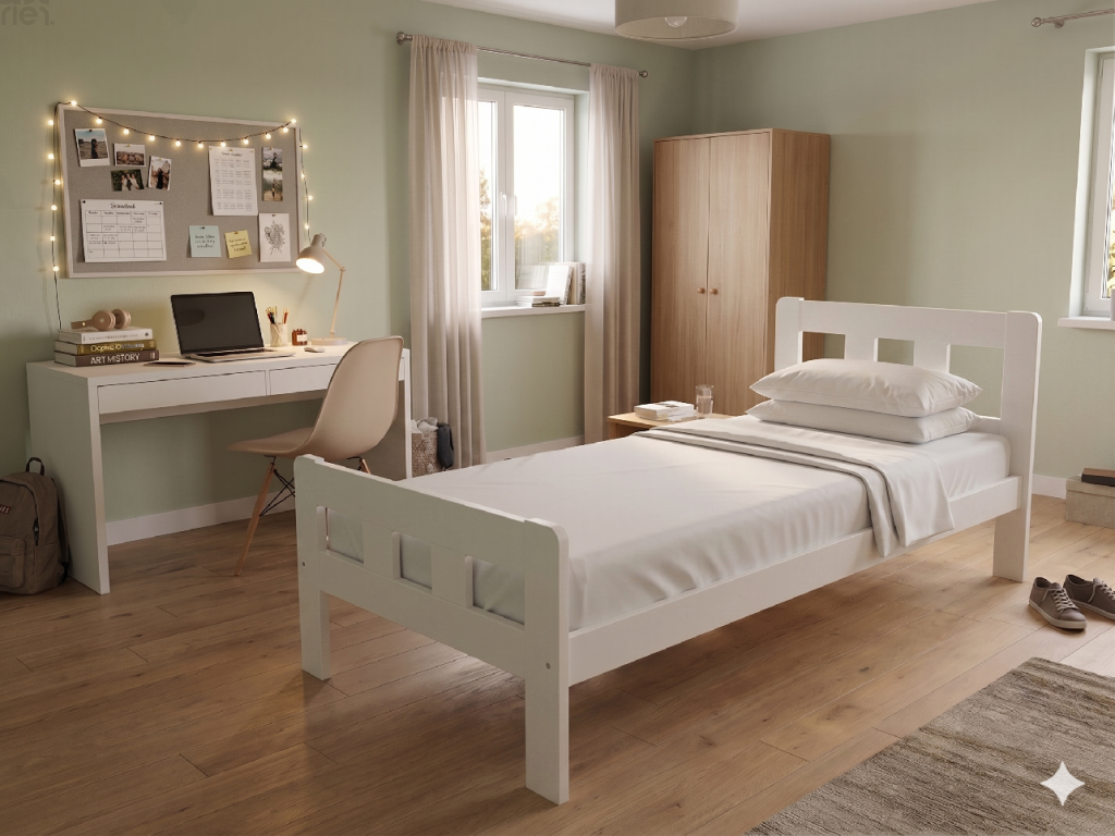 Dřevěná postel 100x200 cm z masivní borovice – VMK10E nabízí pevnost, komfort a přírodní eleganci. Je ideální pro menší ložnice, studentské pokoje nebo hostinské místnosti, kde je důležitá stabilita a dlouhá životnost. Postel je dodávána včetně laťového roštu