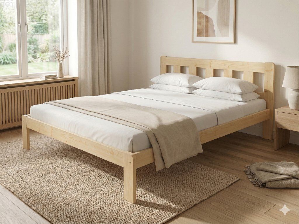 Dřevěná postel 140x200 cm z masivní borovice – VMK10A nabízí pevnost, komfort a přírodní eleganci. Je ideální pro menší ložnice, studentské pokoje nebo hostinské místnosti, kde je důležitá stabilita a dlouhá životnost. Postel je dodávána včetně laťového roštu