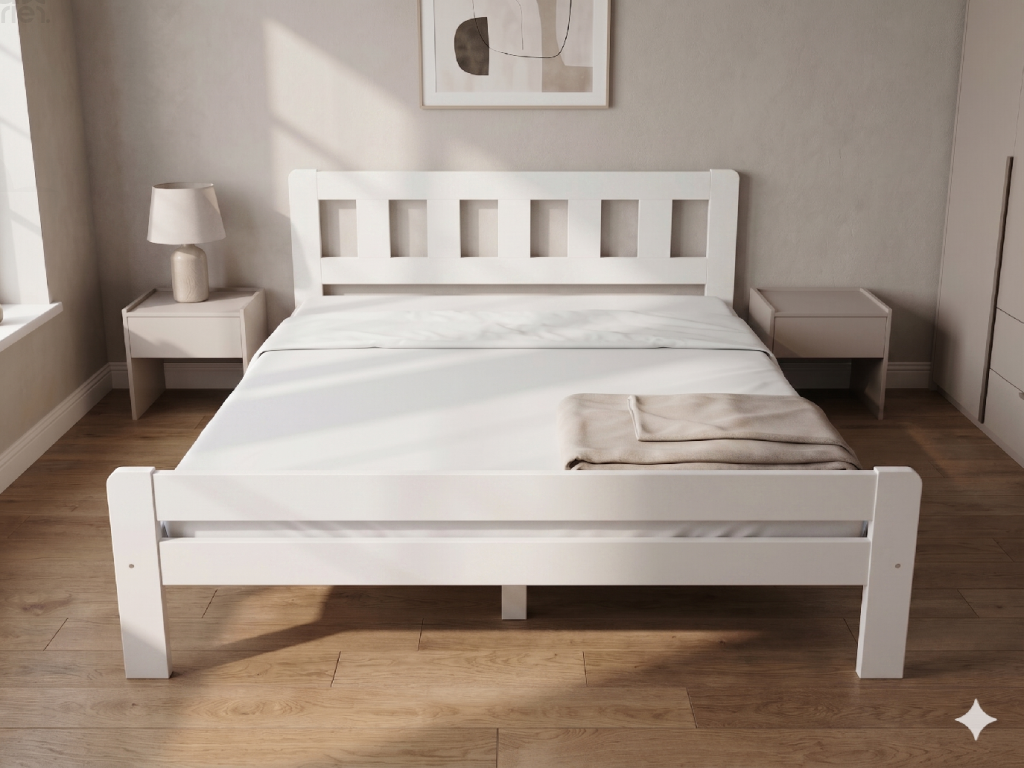 Dřevěná postel 140x200 cm z masivní borovice – VMK10C nabízí pevnost, komfort a přírodní eleganci. Je ideální pro menší ložnice, studentské pokoje nebo hostinské místnosti, kde je důležitá stabilita a dlouhá životnost. Postel je dodávána včetně laťového roštu