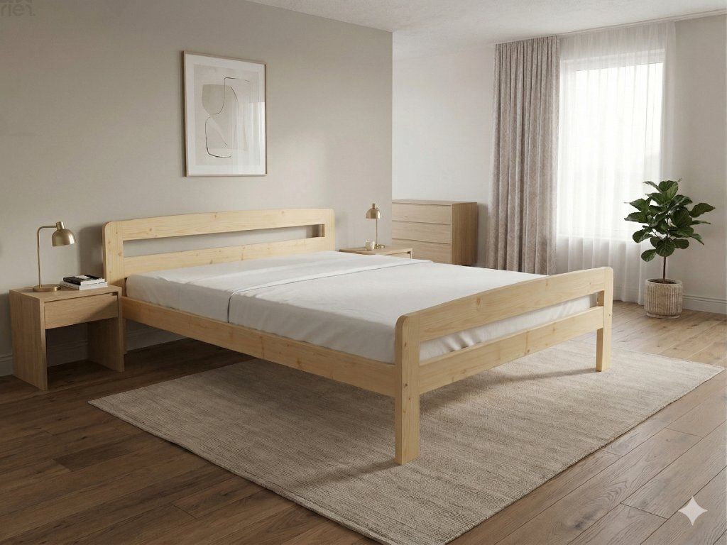 Dřevěná postel 140x200 cm z masivní borovice – VMK8C nabízí pevnost, komfort a přírodní eleganci. Je ideální pro menší ložnice, studentské pokoje nebo hostinské místnosti, kde je důležitá stabilita a dlouhá životnost. Postel je dodávána včetně laťového roštu