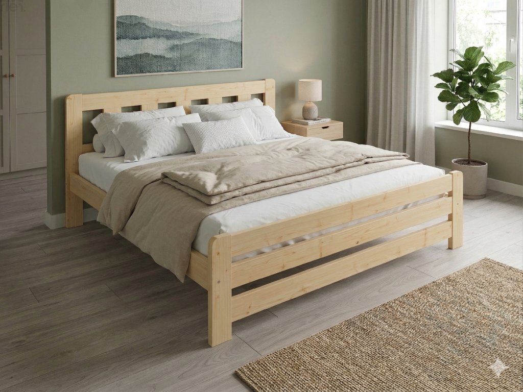 Dřevěná postel 160x200 cm z masivní borovice – VMK10D nabízí pevnost, komfort a přírodní eleganci. Je ideální pro menší ložnice, studentské pokoje nebo hostinské místnosti, kde je důležitá stabilita a dlouhá životnost. Postel je dodávána včetně laťového roštu