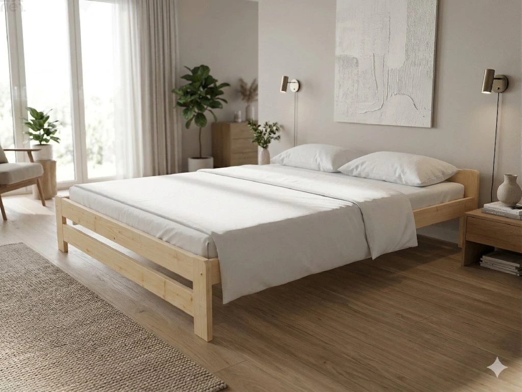 Dřevěná postel 160x200 cm z masivní borovice – VMK3B nabízí pevnost, komfort a přírodní eleganci. Je ideální pro menší ložnice, studentské pokoje nebo hostinské místnosti, kde je důležitá stabilita a dlouhá životnost. Postel je dodávána včetně laťového roštu