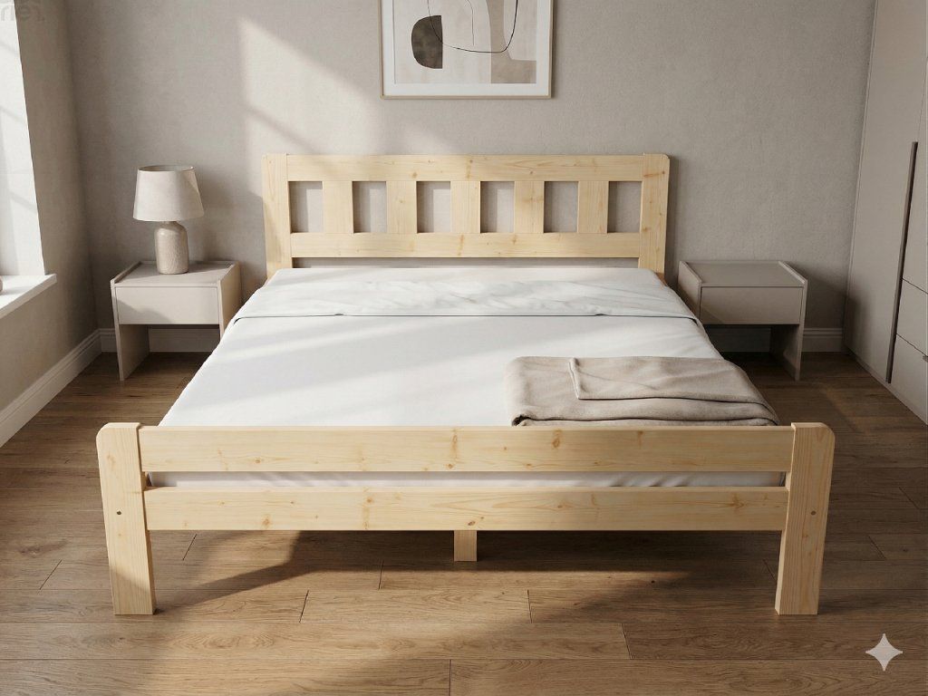 Dřevěná postel 200x200 cm z masivní borovice – VMK10C nabízí pevnost, komfort a přírodní eleganci. Je ideální pro menší ložnice, studentské pokoje nebo hostinské místnosti, kde je důležitá stabilita a dlouhá životnost. Postel je dodávána včetně laťového roštu