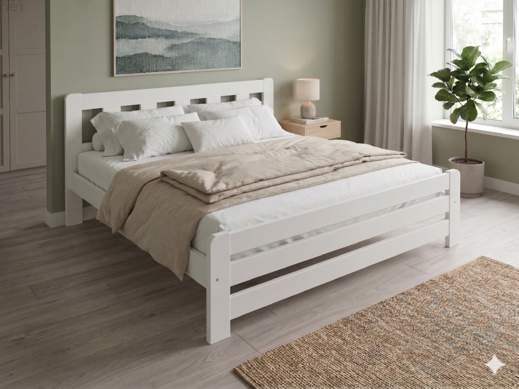 Dřevěná postel 200x200 cm z masivní borovice – VMK10D nabízí pevnost, komfort a přírodní eleganci. Je ideální pro menší ložnice, studentské pokoje nebo hostinské místnosti, kde je důležitá stabilita a dlouhá životnost. Postel je dodávána včetně laťového roštu