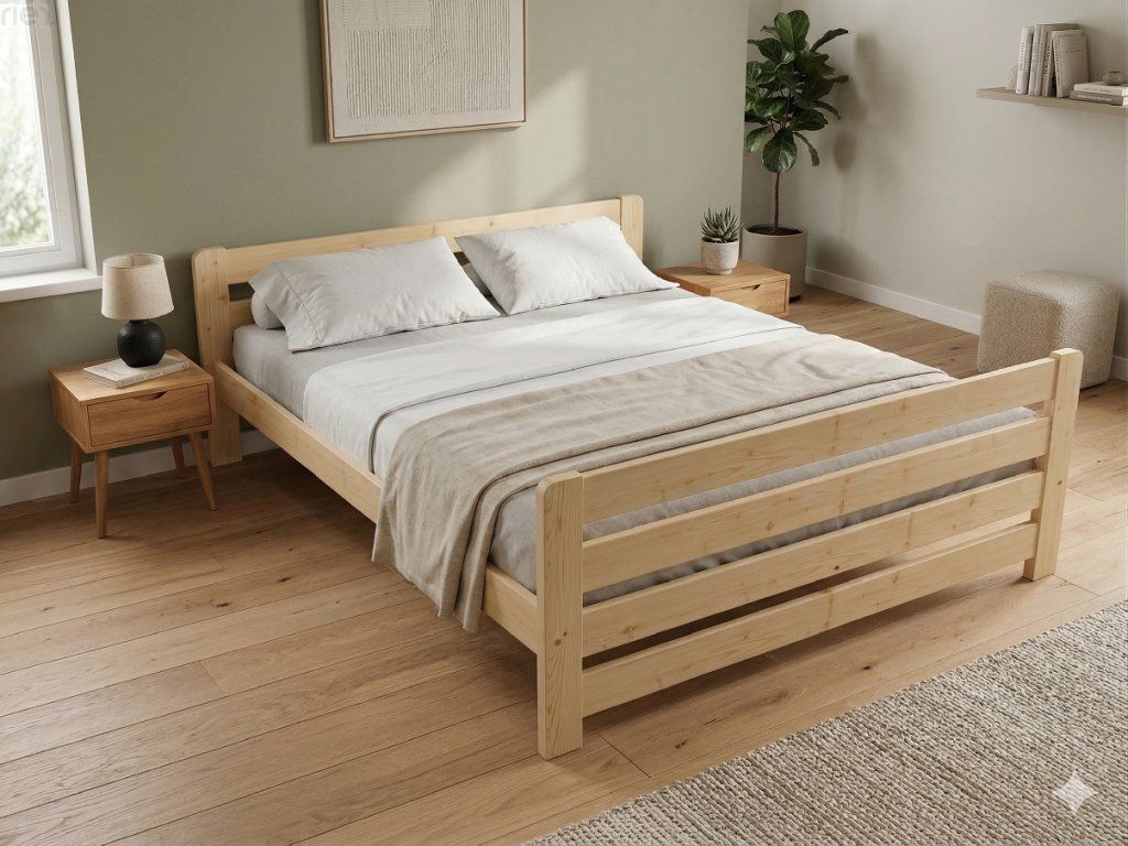 Dřevěná postel 200x200 cm z masivní borovice – VMK2E nabízí pevnost, komfort a přírodní eleganci. Je ideální pro menší ložnice, studentské pokoje nebo hostinské místnosti, kde je důležitá stabilita a dlouhá životnost. Postel je dodávána včetně laťového roštu