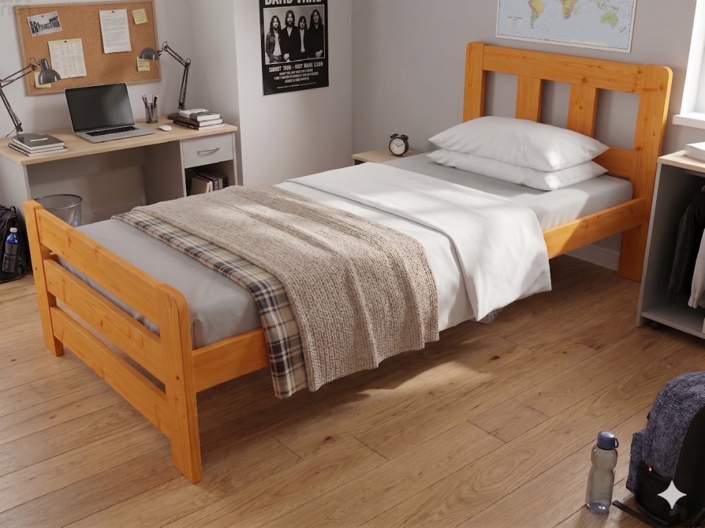 Dřevěná postel 80x200 cm z masivní borovice – VMK10D nabízí pevnost, komfort a přírodní eleganci. Je ideální pro menší ložnice, studentské pokoje nebo hostinské místnosti, kde je důležitá stabilita a dlouhá životnost. Postel je dodávána včetně laťového roštu