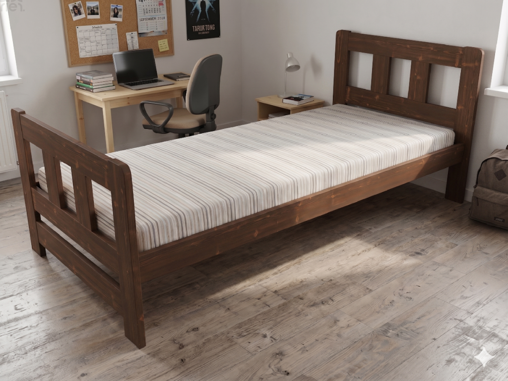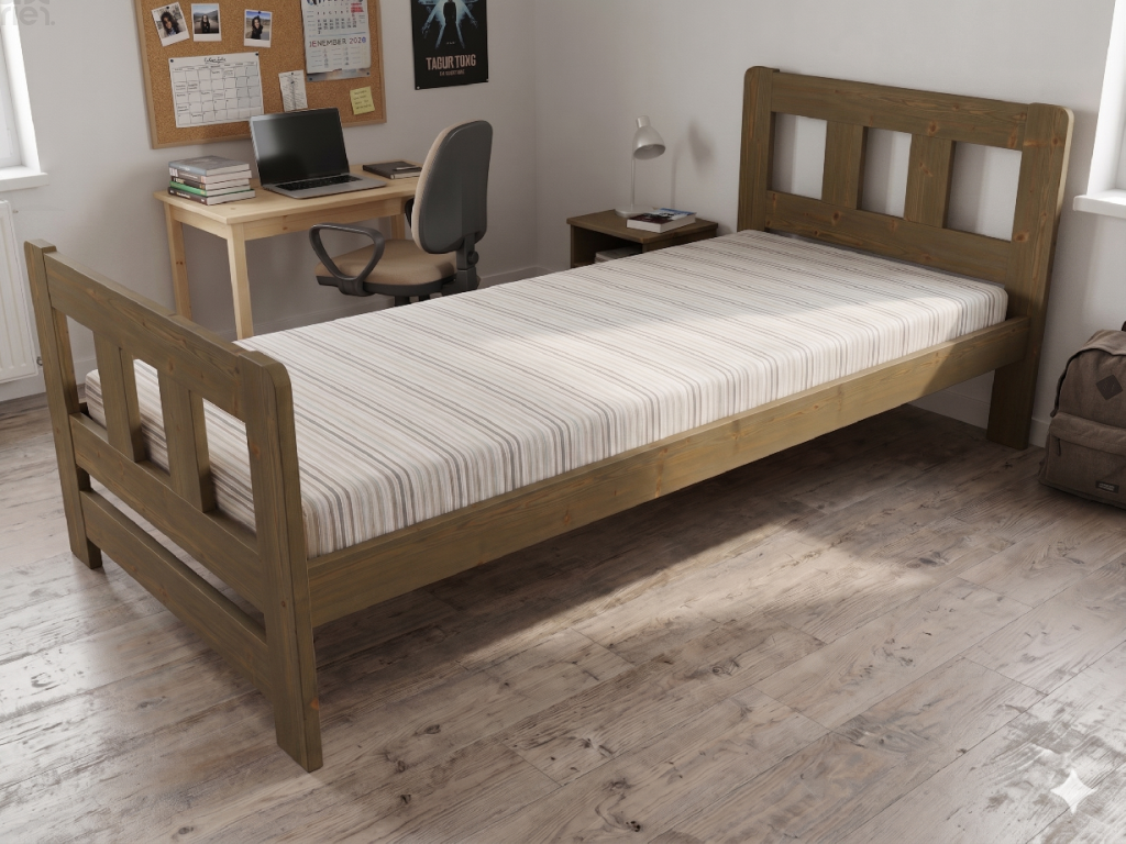 Dřevěná postel 80x200 cm z masivní borovice – VMK10F nabízí pevnost, komfort a přírodní eleganci. Je ideální pro menší ložnice, studentské pokoje nebo hostinské místnosti, kde je důležitá stabilita a dlouhá životnost. Postel je dodávána včetně laťového roštu