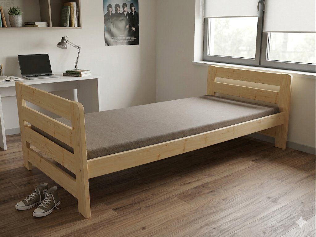 Dřevěná postel 80x200 cm z masivní borovice – VMK2E nabízí pevnost, komfort a přírodní eleganci. Je ideální pro menší ložnice, studentské pokoje nebo hostinské místnosti, kde je důležitá stabilita a dlouhá životnost. Postel je dodávána včetně laťového roštu