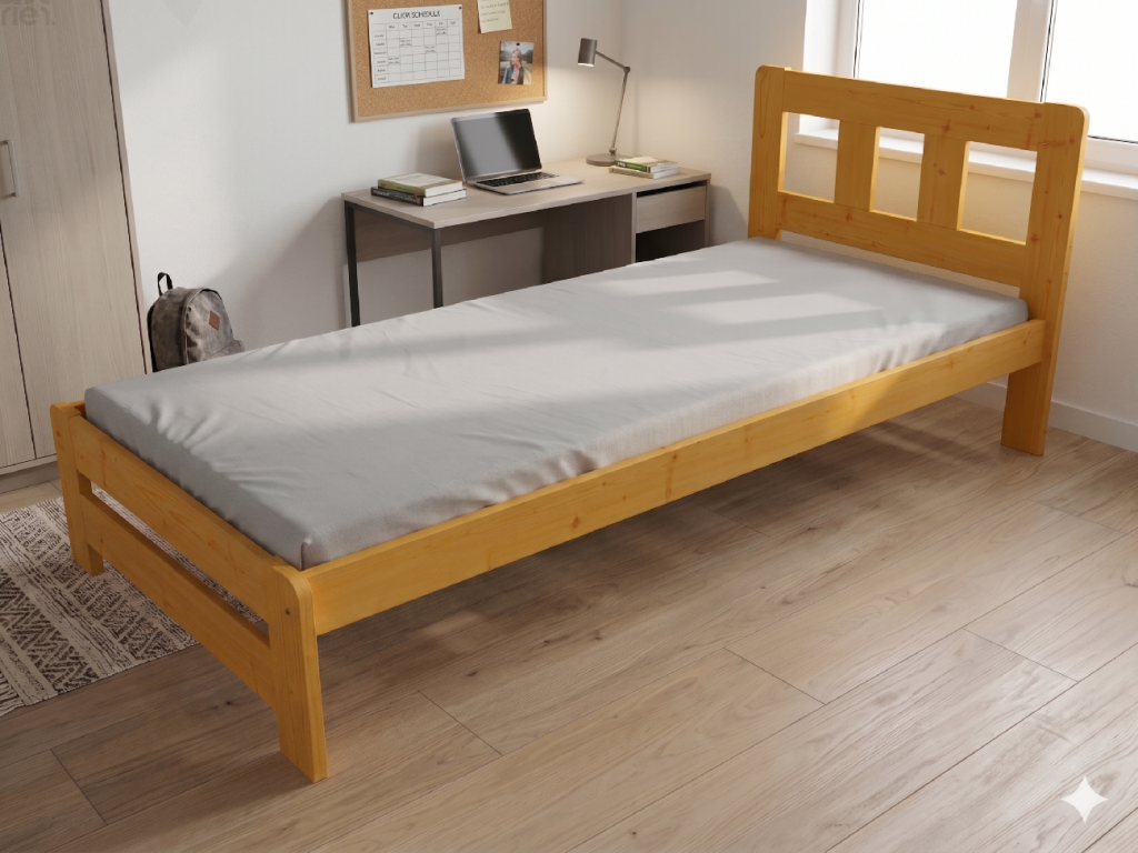 Dřevěná postel 90x200 cm z masivní borovice – VMK10B nabízí pevnost, komfort a přírodní eleganci. Je ideální pro menší ložnice, studentské pokoje nebo hostinské místnosti, kde je důležitá stabilita a dlouhá životnost. Postel je dodávána včetně laťového roštu
