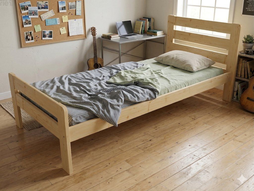 Dřevěná postel 90x200 cm z masivní borovice – VMK1C nabízí pevnost, komfort a přírodní eleganci. Je ideální pro menší ložnice, studentské pokoje nebo hostinské místnosti, kde je důležitá stabilita a dlouhá životnost. Postel je dodávána včetně laťového roštu