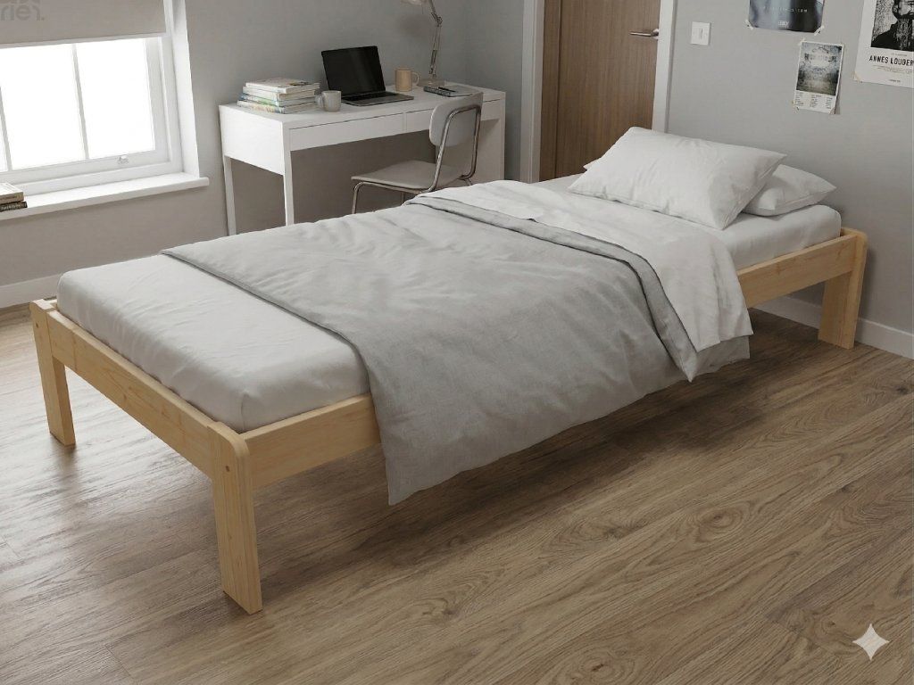 Dřevěná postel 90x200 cm z masivní borovice – VMK4A nabízí pevnost, komfort a přírodní eleganci. Je ideální pro menší ložnice, studentské pokoje nebo hostinské místnosti, kde je důležitá stabilita a dlouhá životnost. Postel je dodávána včetně laťového roštu