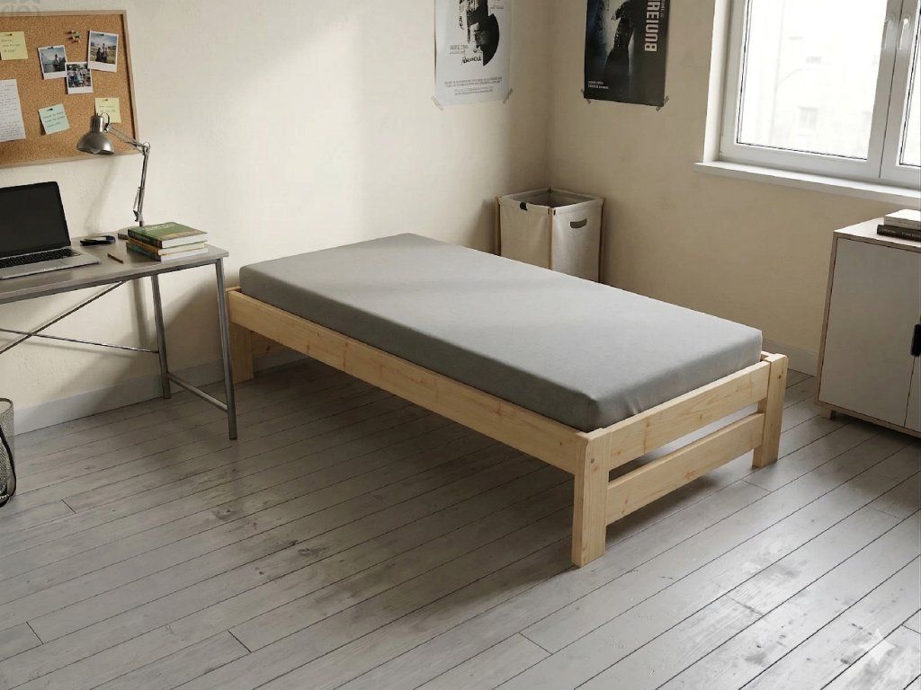Dřevěná postel 90x200 cm z masivní borovice – VMK4B nabízí pevnost, komfort a přírodní eleganci. Je ideální pro menší ložnice, studentské pokoje nebo hostinské místnosti, kde je důležitá stabilita a dlouhá životnost. Postel je dodávána včetně laťového roštu