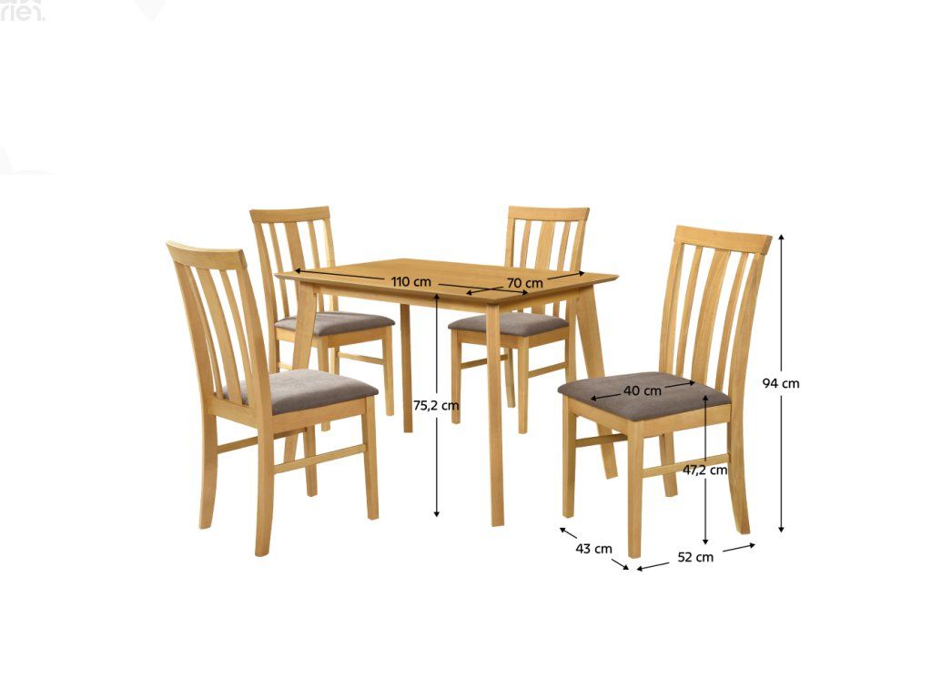 Stůl i židle jsou vyrobeny z kvalitního kaučukového dřeva, MDF a dýhy, díky čemuž nabízí vysokou pevnost, stabilitu a dlouhou životnost. Židle jsou čalouněny příjemnou látkou, která zajišťuje komfortní sezení i při delším stolování. Set je ideální pro každodenní použití v kuchyni nebo jídelně, a to jak v menších, tak středně velkých prostorech.