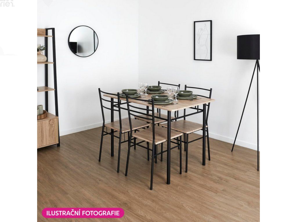 Jídelní set RAYNELL 1+4 v kombinaci dekoru dub sonoma a černé kovové konstrukce přináší nadčasový vzhled a praktické využití pro každodenní stolování. Díky kompaktním rozměrům se snadno začlení do menších bytů, kuchyní i jídelních koutů. Elegantní provedení a jednoduché linie zajišťují, že set působí lehce a vzdušně, přesto pevně a stabilně.