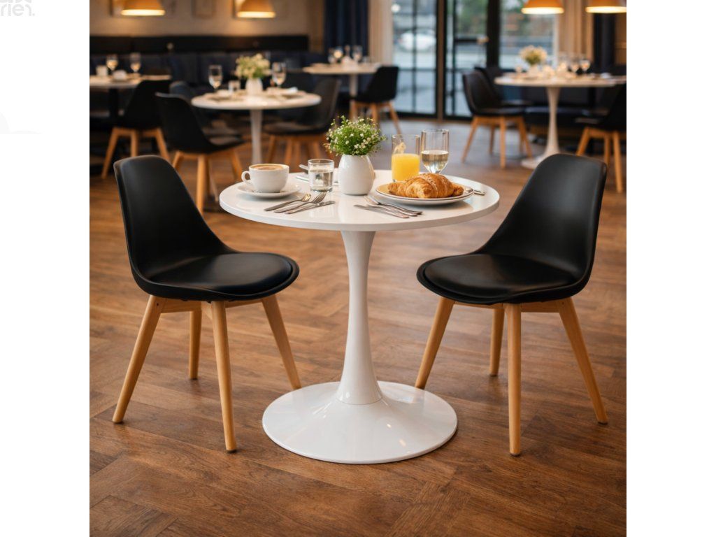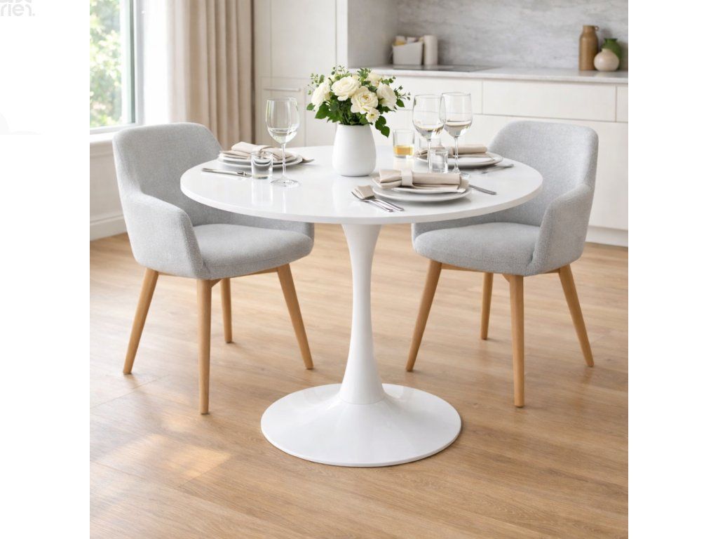 Kulatý jídelní stůl MOGENS spojuje moderní design s praktickou funkčností. Elegantní bílý povrch a pevná kovová podstava vnese do vaší jídelny nadčasový vzhled a harmonii.