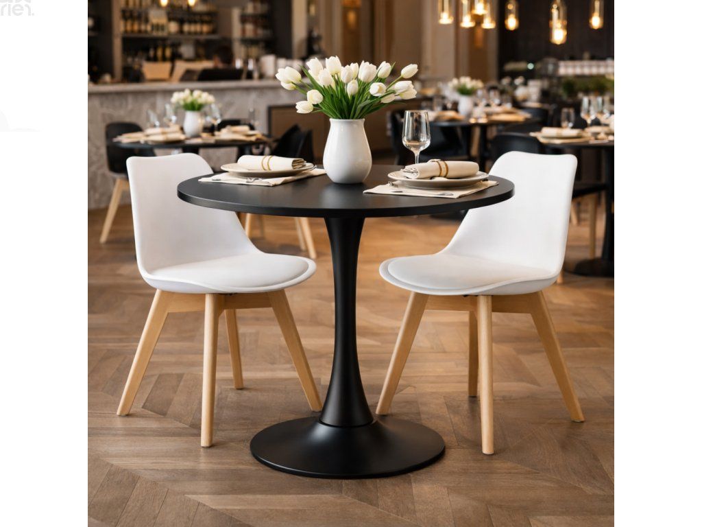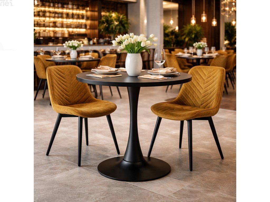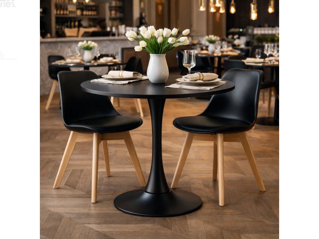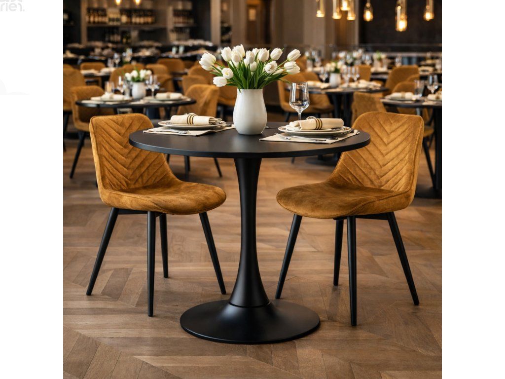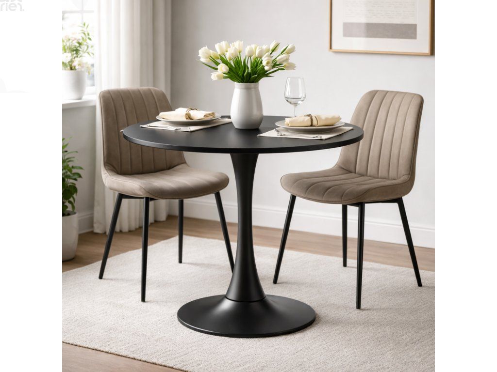 Kulatý jídelní stůl MOGENS spojuje moderní design s praktickou funkčností. Elegantní černý povrch a pevná kovová podstava vnese do vaší jídelny nadčasový vzhled a harmonii.