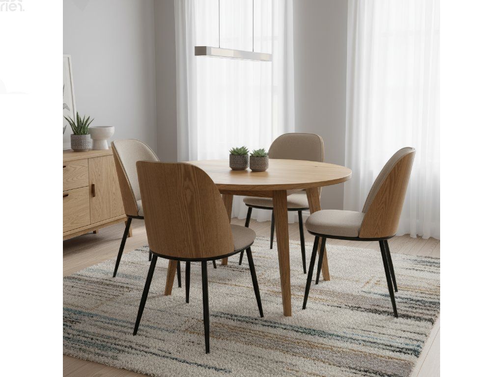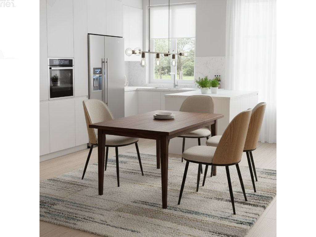 Elegantní kombinace barev: Béžovohnědá látka s přírodním dřevem a černými detaily dodává jídelně nadčasový a sofistikovaný vzhled.