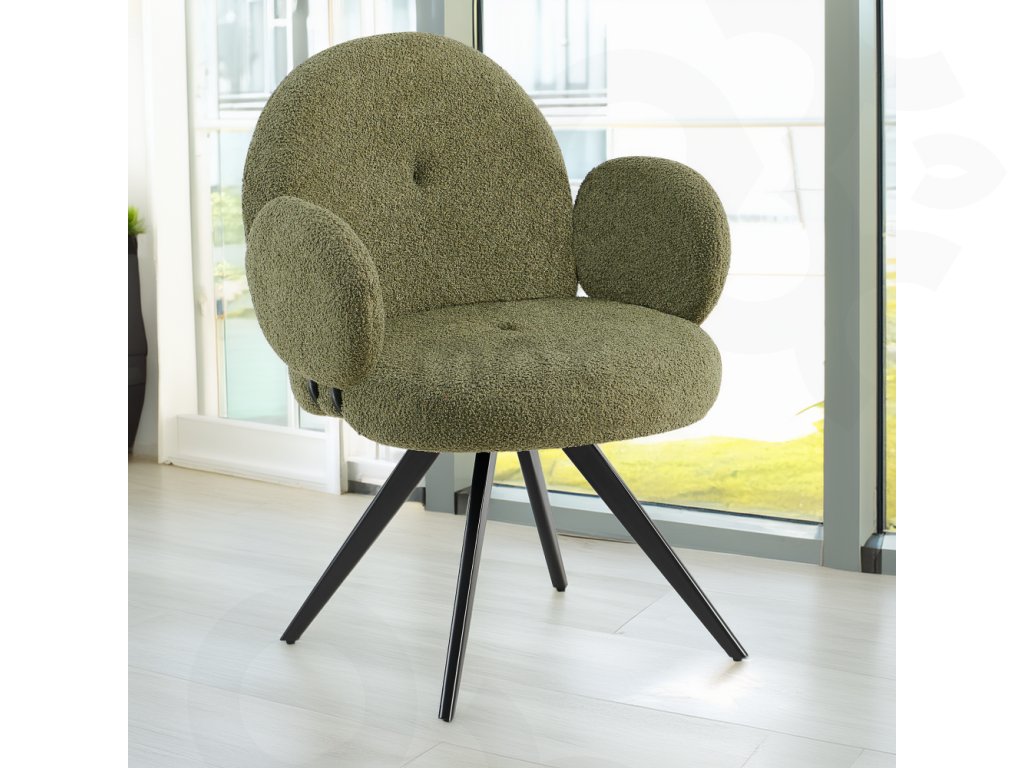 Otočná jídelní židle JORITH v kombinaci zelené a černé přináší moderní design, vysoký komfort a praktickou funkčnost. Hebká látka Bouclé podtrhuje luxusní vzhled a zároveň poskytuje vysokou odolnost s hodnotou 45 000 cyklů, což zaručuje dlouhou životnost i při každodenním používání. Stabilní kovová konstrukce v černém provedení, pohodlné čalounění a ergonomické opěrky rukou vytvářejí příjemné a pevné sezení.