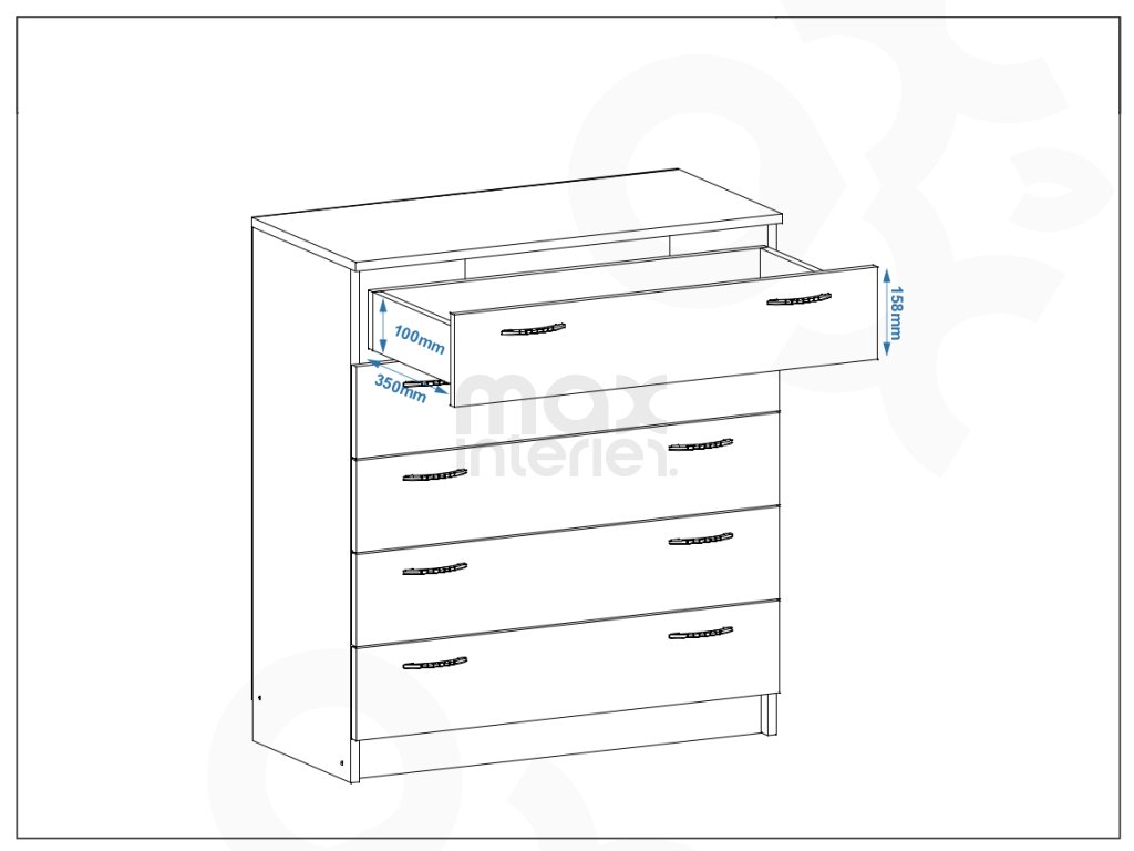 Komoda K-5 je elegantní a praktický kus nábytku, který nabízí dostatek úložného prostoru díky pěti prostorným zásuvkám. Je ideální pro organizaci a uložení vašich věcí v obývacím pokoji, ložnici nebo kanceláři.