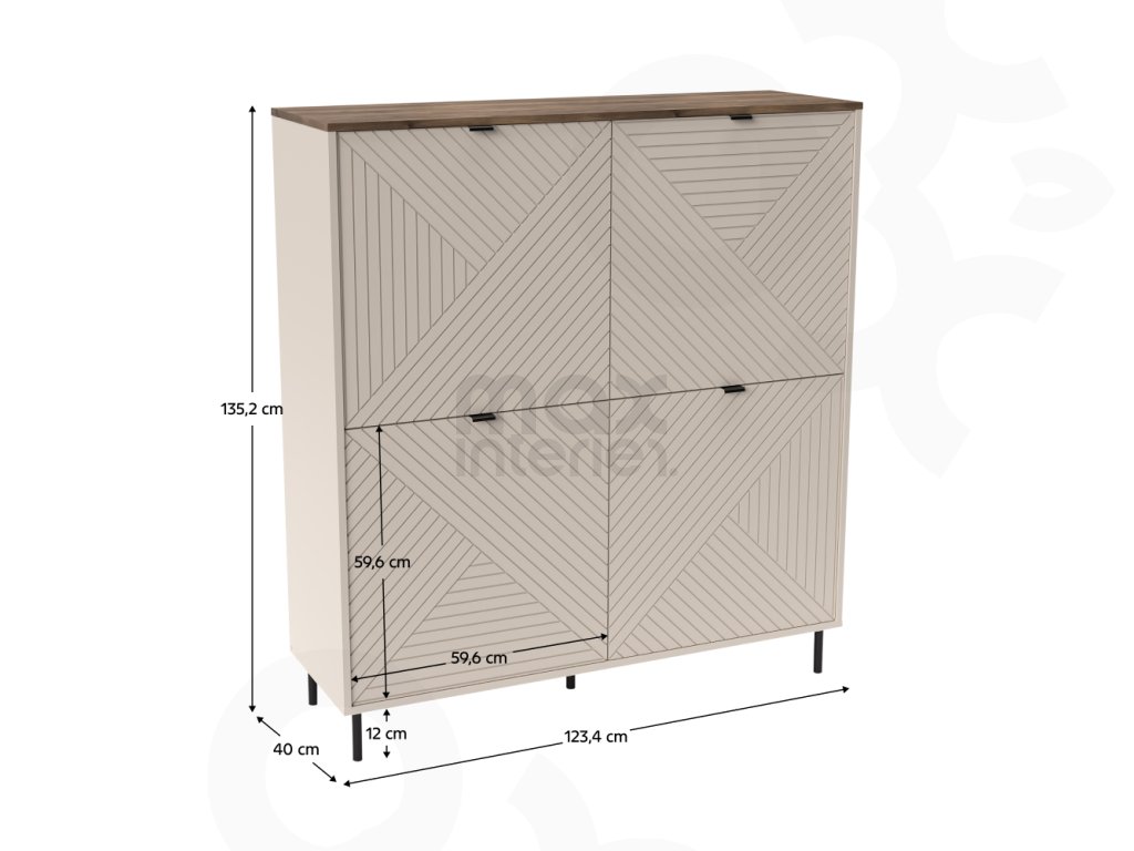 Rozměry komody jsou 123,4 × 40 × 135,2 cm, tloušťka materiálu 1,6 cm. Komoda ESCANOR 4D spojuje moderní design, funkčnost a odolné materiály, které zajišťují kvalitu a dlouhodobou spokojenost s produktem.