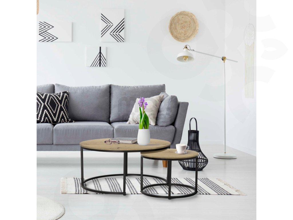 Konferenční stolek CHARLY je praktický set dvou stolků v elegantní kombinaci dub / černá, který skvěle doplní váš obývací pokoj. Větší stolek o průměru 80 cm a výšce 48 cm a menší stolek o průměru 48 cm a výšce 42 cm lze prakticky zasunout jeden pod druhý, což šetří místo a nabízí flexibilní řešení pro každodenní použití.