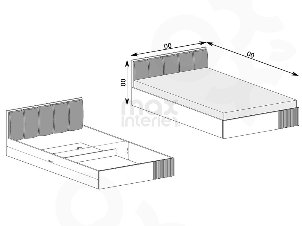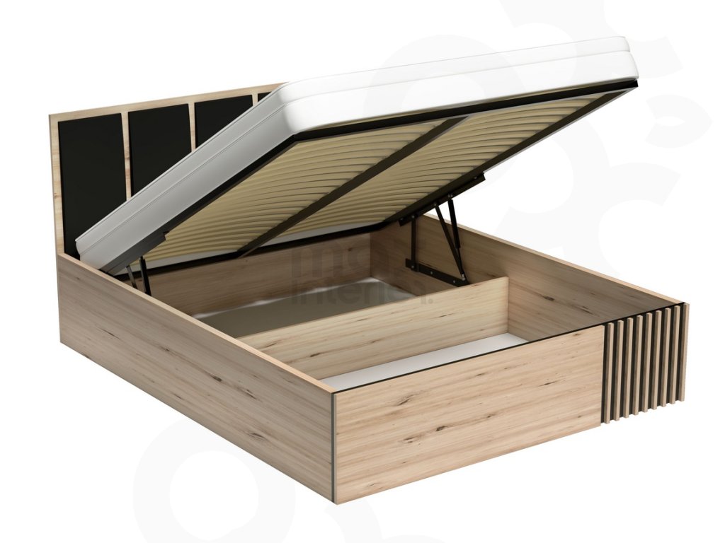 Manželská postel se zvedacím roštem a úložným prostorem (167,3 x 100 x 207 cm) – ideální pro uložení ložního prádla a sezónních věcí, čelo postele je doplněno polstrováním pro pohodlí při čtení nebo odpočinku. Postel je bez matrace (doporučený rozměr 160 x 200 cm nebo 2 × 80 x 200 cm).