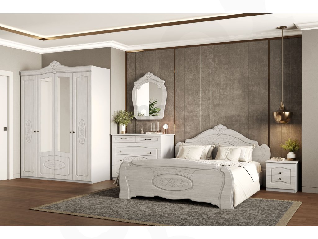 Kompletní vybavení ložnice: postel s roštem, šatní skříň, komoda, noční stolek a nástěnné zrcadlo.