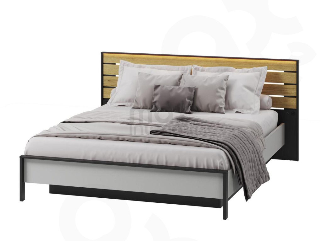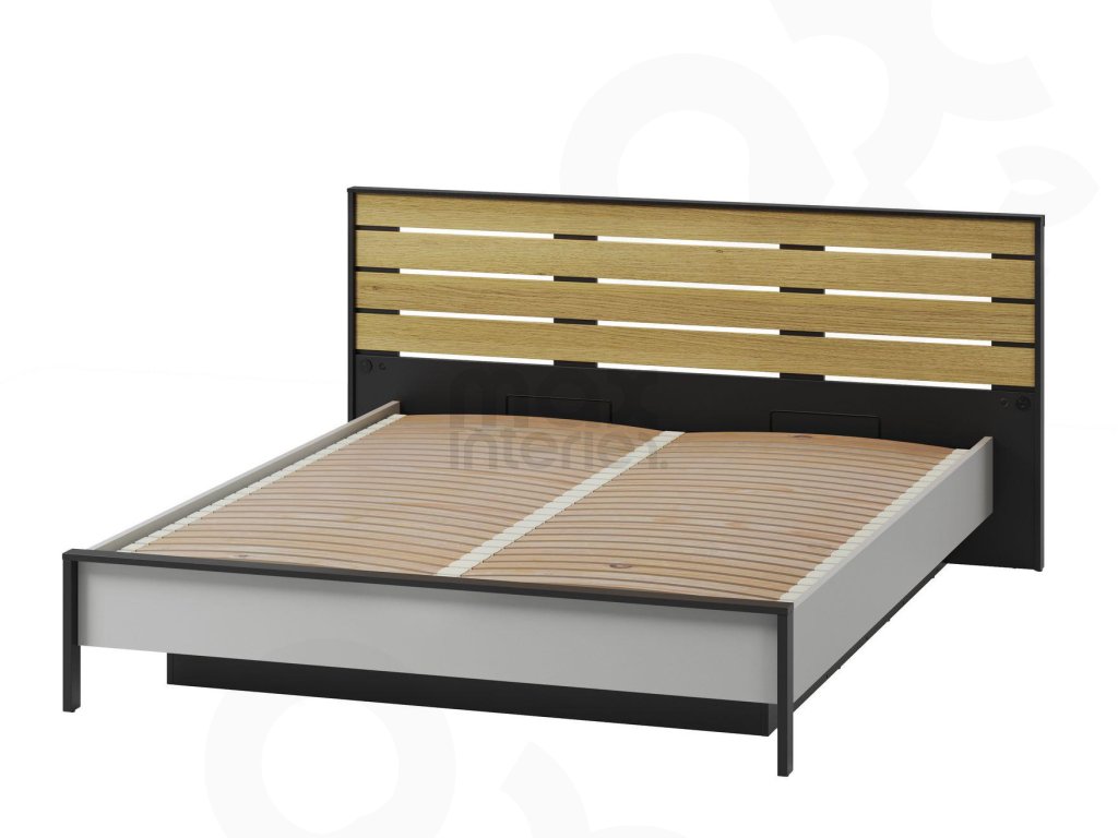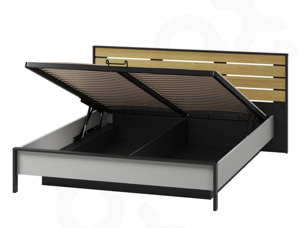 Luxusní design a moderní barvy – jemná šedá s černými detaily a čelo v odstínu dubu dodávají ložnici nadčasový vzhled a útulnou atmosféru.