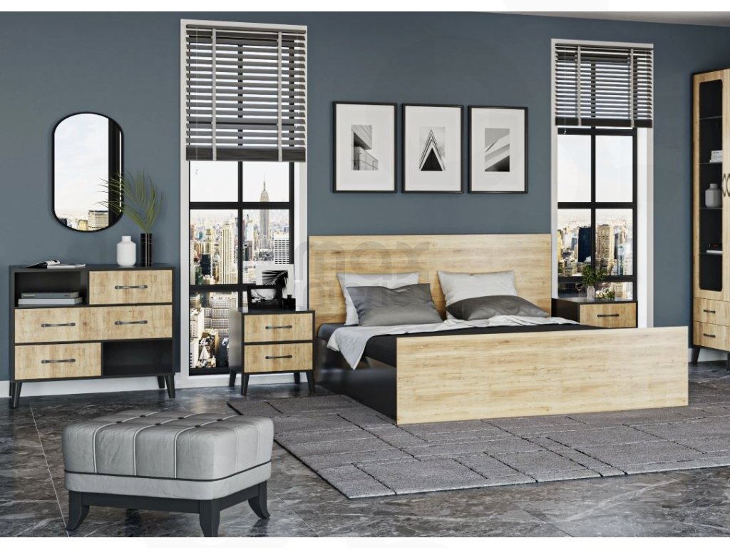 Ložnicová sestava TARIA kombinuje moderní design s praktickým využitím prostoru. Elegantní kombinace dub wotan a antracitu vnese do vaší ložnice nadčasový vzhled a harmonii. Sestava je vyrobena z kvalitní LTD desky tloušťky 16 mm, zatímco čela postele a zásuvek jsou z pevné MDF desky, což zajišťuje dlouhou životnost a odolnost nábytku.