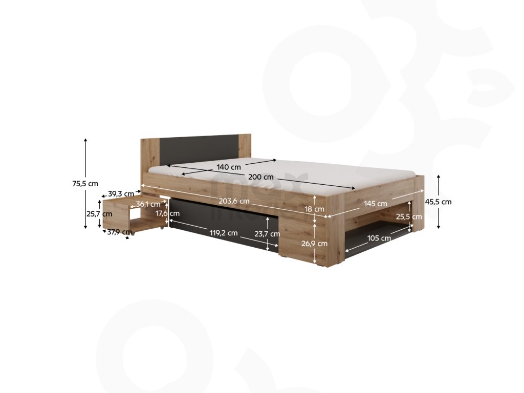 Praktičnost: 2x úložný prostor a 2x noční stolek na kolečkách – snadný přístup k věcem a více místa v ložnici.