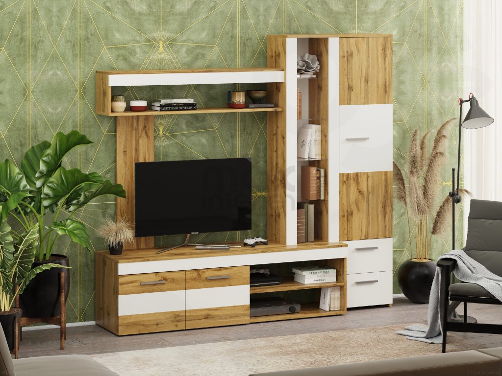 Obývací stěna Neapol je moderní a elegantní nábytek, který přinese do vašeho obývacího pokoje nejen styl, ale i maximální funkčnost. S vkusným designem v kombinaci světlého dřeva a tmavších akcentů se hodí do různých interiérů, od minimalistických po tradiční. Nabízí dostatek úložného prostoru díky praktickým skříním, poličkám a prostorné TV skříni. Díky své univerzálnosti ji snadno sladíte s dalšími prvky ve vašem interiéru a vytvoříte tak harmonický a příjemný prostor pro relaxaci i setkání s přáteli.