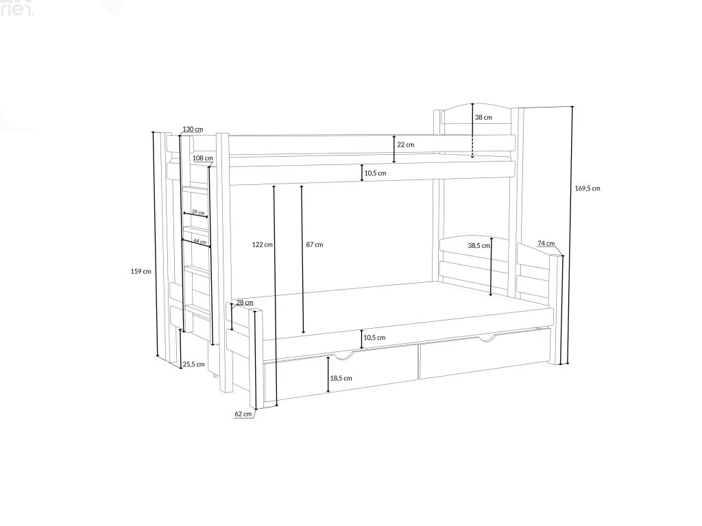 Patrová postel s rozšířeným spodním lůžkem je vyrobena z masivu borovice, spoje jsou řešeny bukovými kolíky spolu se zámkovým šroubem. Snadná montáž dle přiloženého obrázkového návodu. Síla použitého materiálu je 2,6 cm.