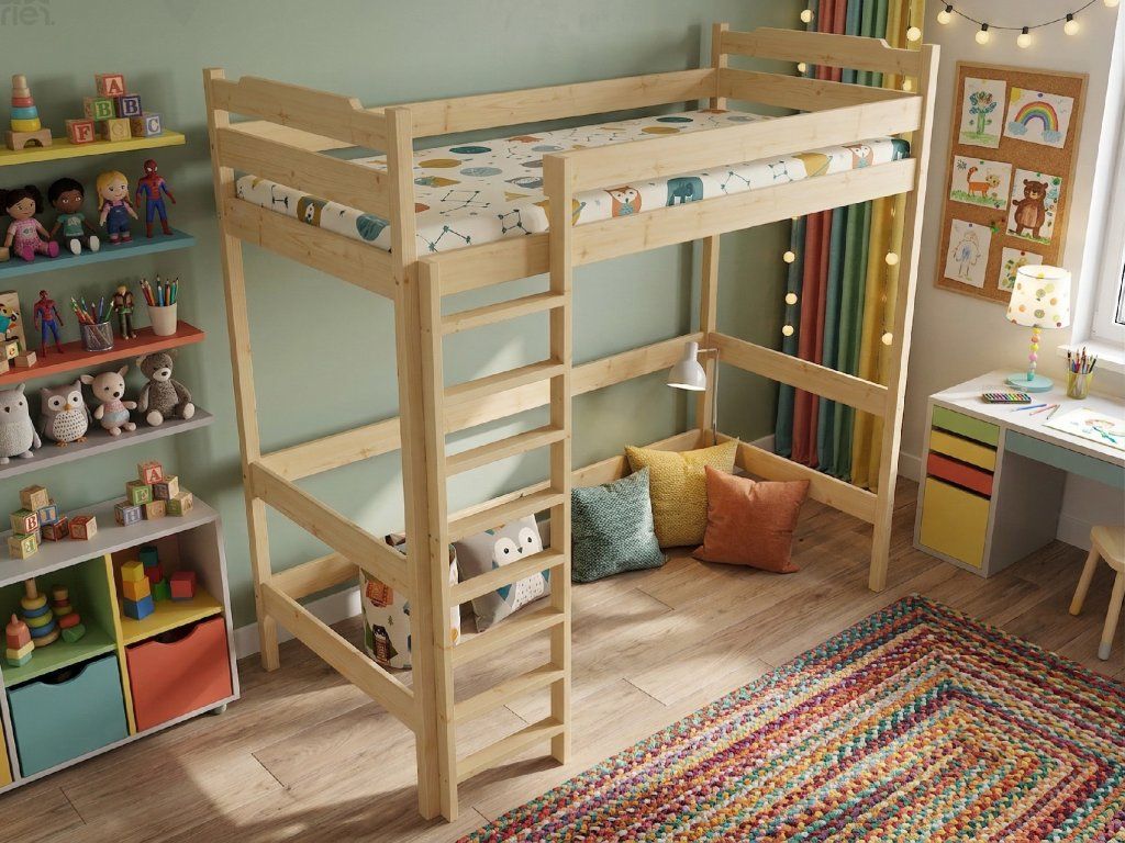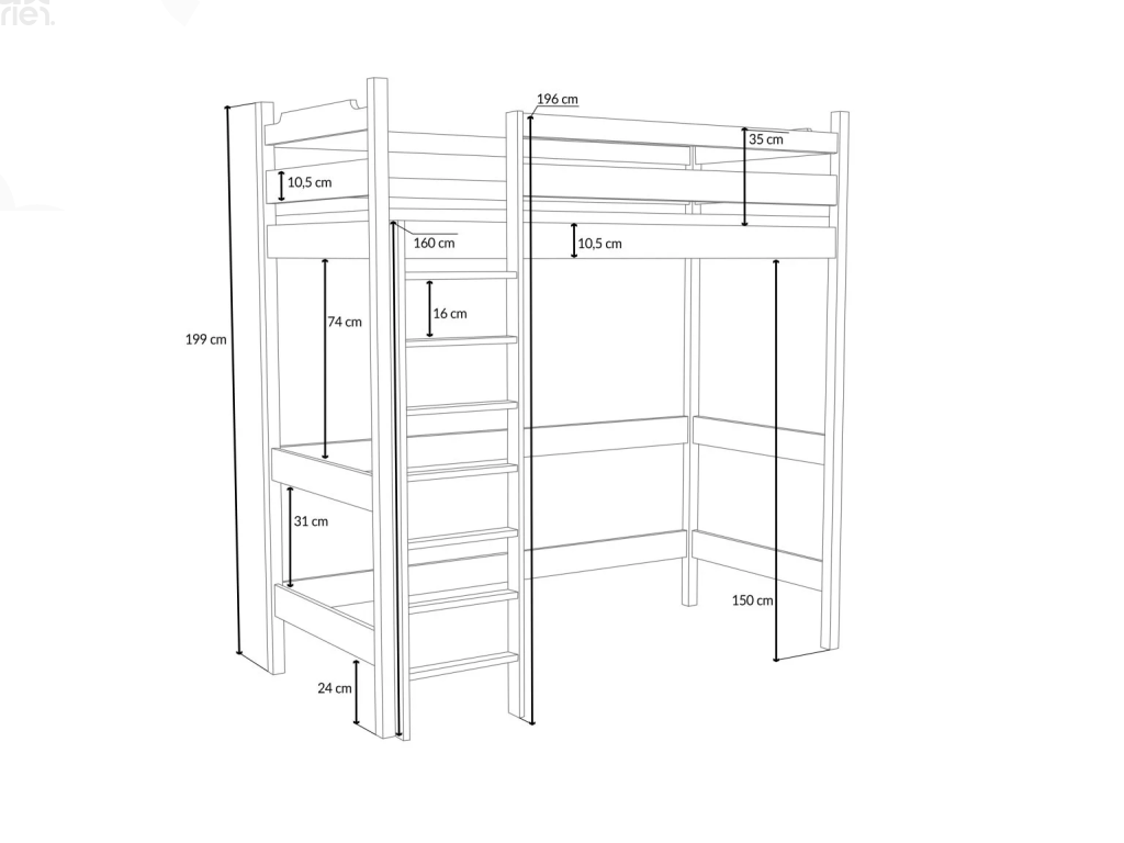 Patrová postel je vyrobena z masivu borovice, spoje jsou řešeny bukovými kolíky spolu se zámkovým šroubem. Snadná montáž dle přiloženého obrázkového návodu. Síla použitého materiálu je 2,6 cm.