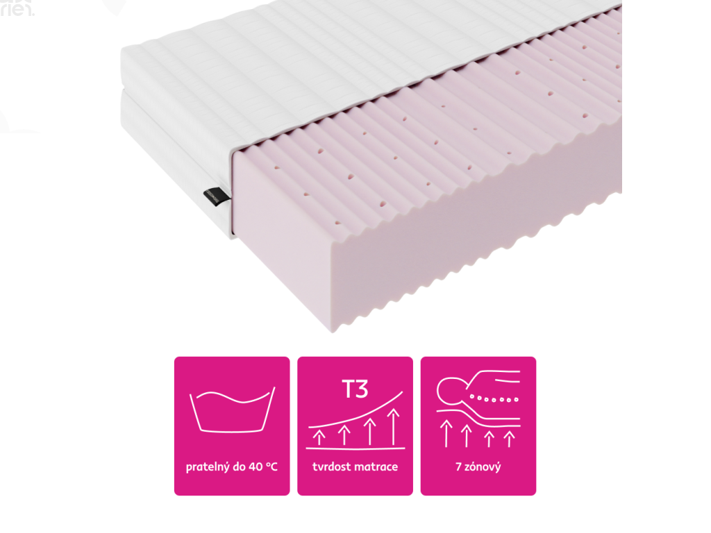 Jádro matrace tvoří kvalitní PUR pěna se 7zónovou profilací, která se přizpůsobuje jednotlivým částem těla a pomáhá rovnoměrně rozložit tlak. Perforované jádro zároveň podporuje cirkulaci vzduchu, čímž přispívá k hygienickému prostředí a omezuje nadměrné zahřívání během spánku. Matrace je oboustranná, což umožňuje její pravidelné otáčení a prodloužení životnosti.