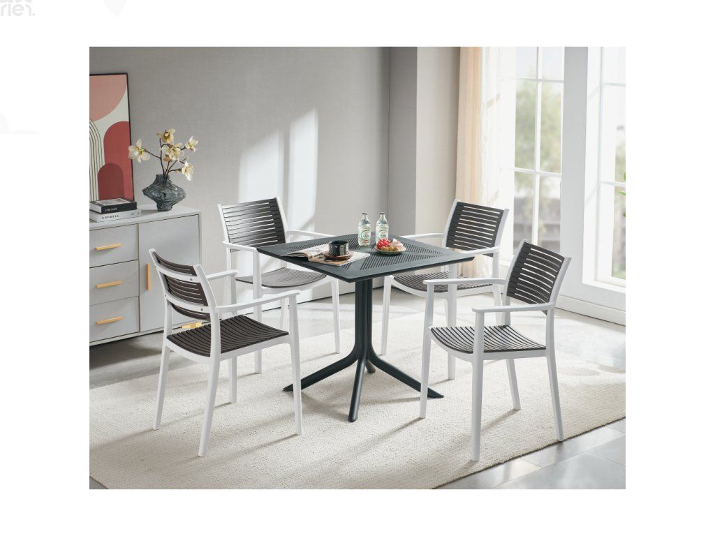 Jídelní židle HERTA v elegantní kombinaci bílé a šedohnědé barvy spojuje styl, odolnost a pohodlí. Ideální pro terasy, balkóny, kavárny, restaurace či hotelové prostory, zajišťuje komfortní posezení po dlouhé hodiny.