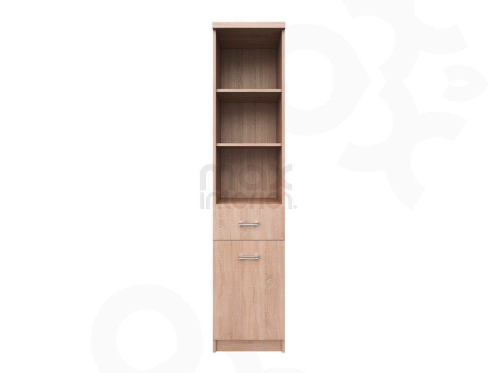 Regál disponuje jednodveřovou skříňkou, jedním šuplíkem a otevřenými policemi, což umožňuje kombinovat uzavřené i otevřené úložné prostory podle vašich potřeb. S rozměry 40 × 33 × 183 cm je vhodný do obývacího pokoje, pracovny, ložnice nebo dětského pokoje. Světlý odstín dub sonoma opticky prostor prosvětluje a snadno se kombinuje s ostatním nábytkem.