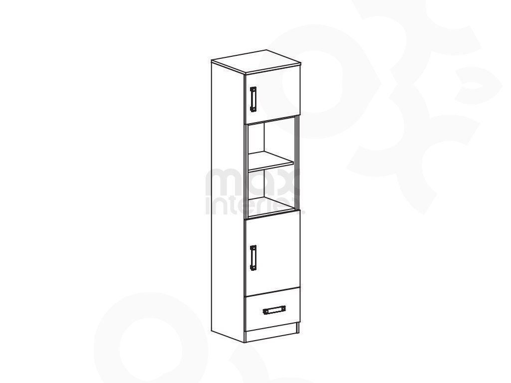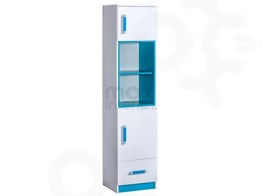 Praktický úložný prostor – vysoký regál s policemi a zásuvkami na hračky, knihy a školní potřeby.