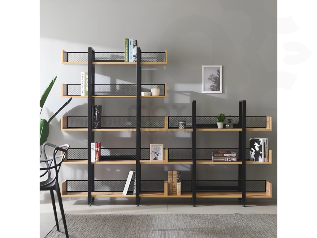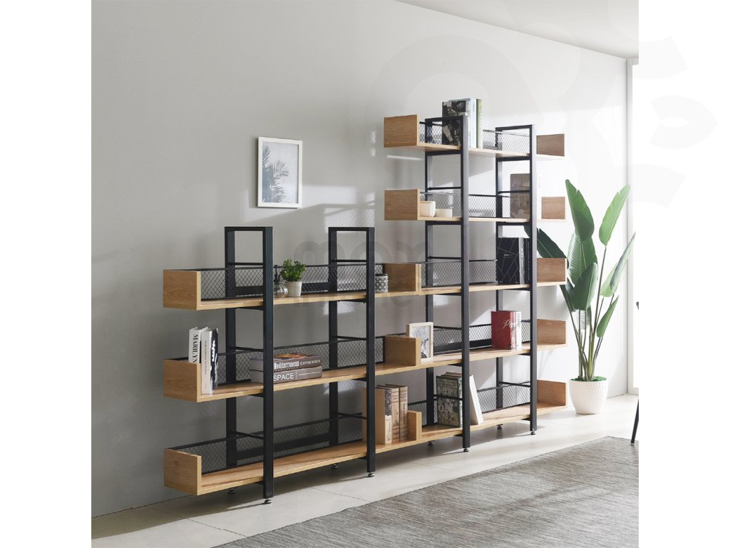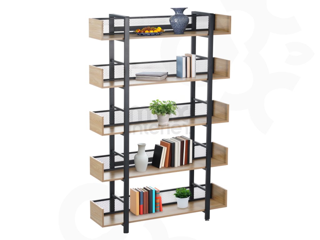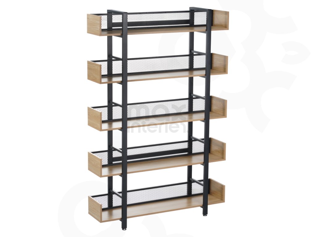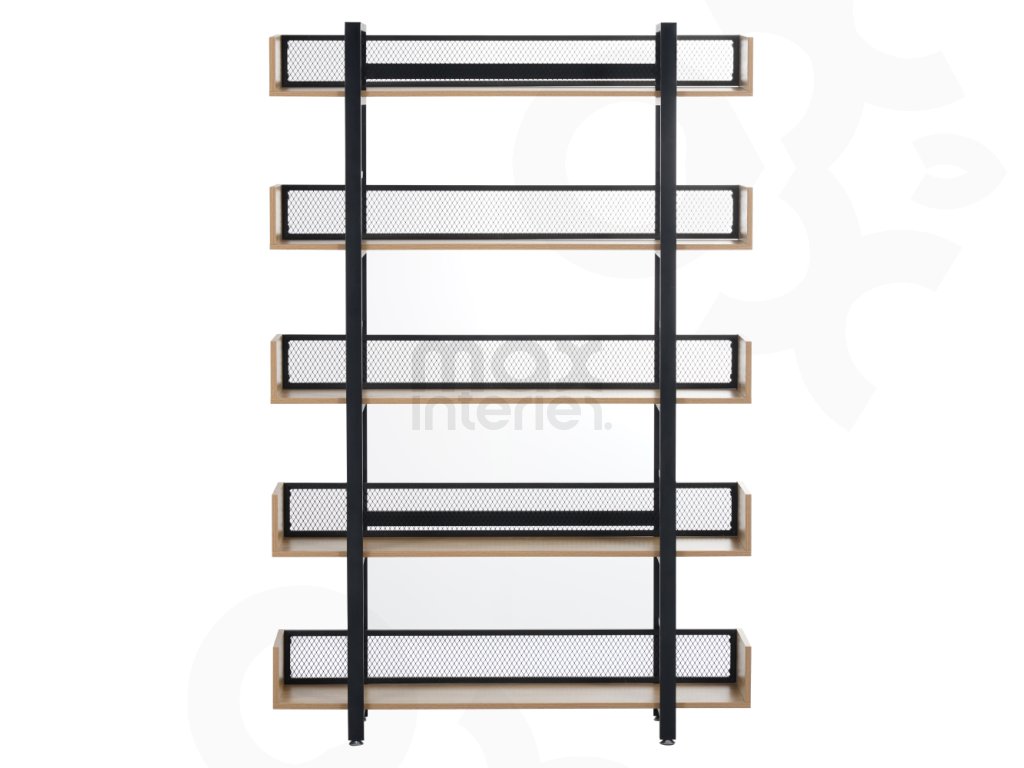Robustní kovová konstrukce zajišťuje stabilitu, zatímco 5 prostorných polic nabízí dostatek místa pro knihy, dekorace, rostliny i úložné boxy. Zadní část je opatřena kovovou síťkou, která chrání uložené předměty a zároveň podtrhuje industriální vzhled.