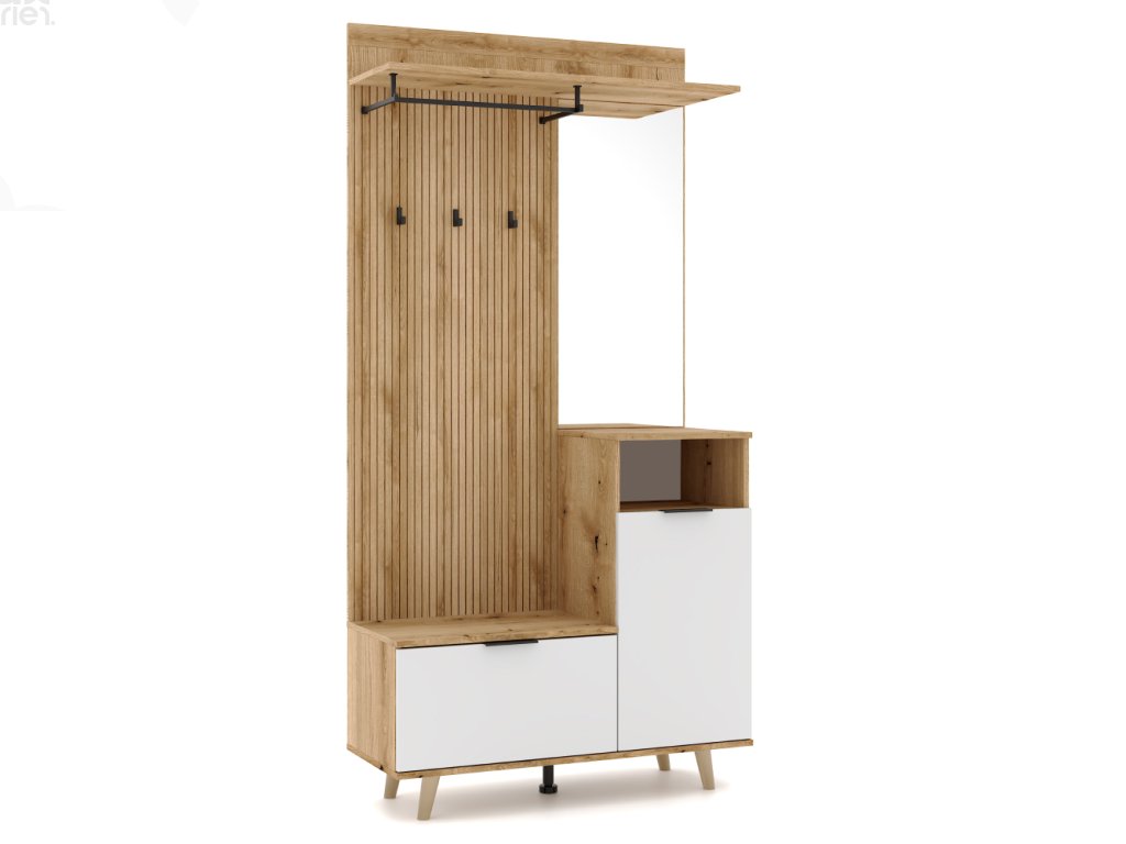 Konstrukce je vyrobena z kvalitního materiálu DTD s odolnými ABS hranami, které chrání nábytek před mechanickým poškozením a prodlužují jeho životnost. Předsíňová stěna nabízí otevřený úložný prostor, skříňku s policemi, výklopný botník a věšákovou část se třemi háčky pro každodenní odkládání oblečení a doplňků. Praktické zrcadlo zvyšuje komfort při oblékání a zároveň opticky zvětšuje prostor předsíně.
