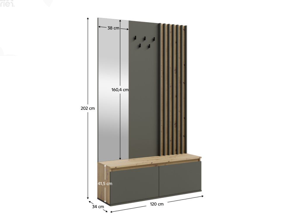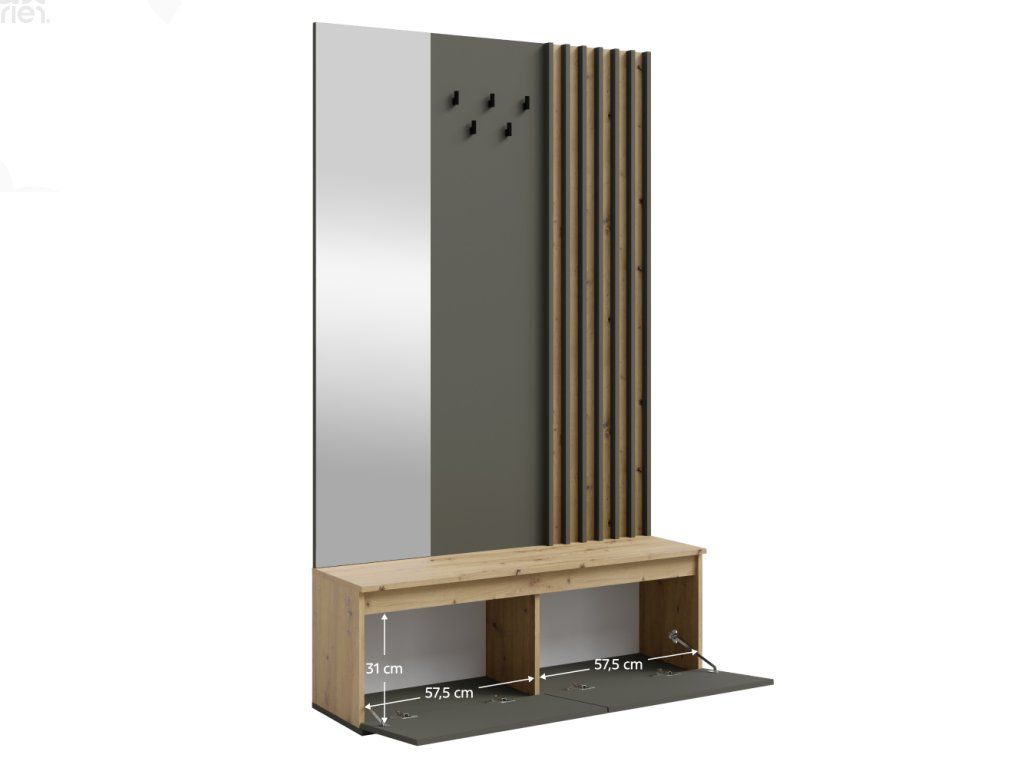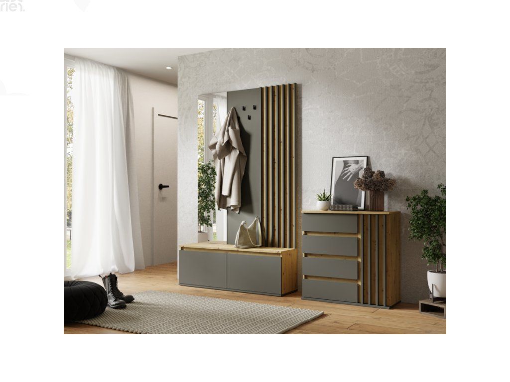 Moderní předsíňová stěna RUSHDI v kombinaci grafitu a dubu artisan je praktickým a stylovým řešením do každé předsíně. Nabízí elegantní vzhled, přehledné úložné prostory a dostatek místa pro kabáty, obuv a doplňky. Velké zrcadlo opticky zvětšuje prostor a usnadňuje každodenní kontrolu vzhledu. Ozdobné lamely dodávají celé sestavě nadčasový a luxusní charakter.