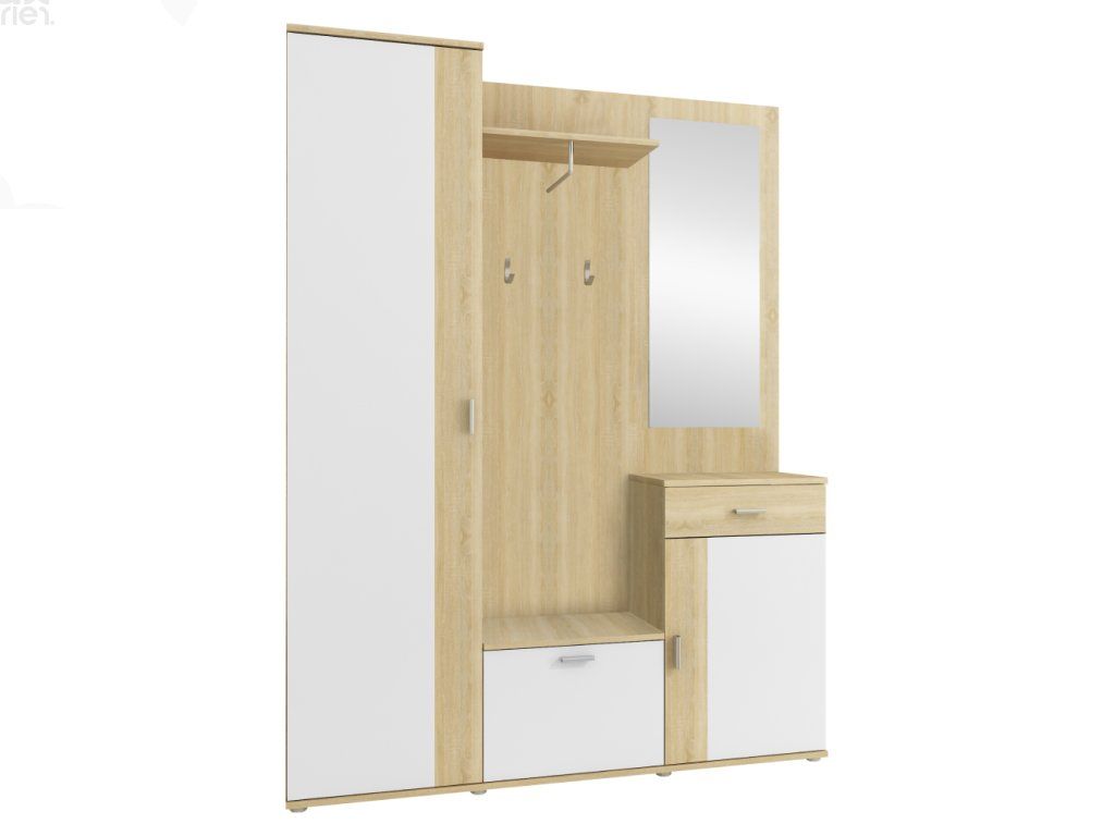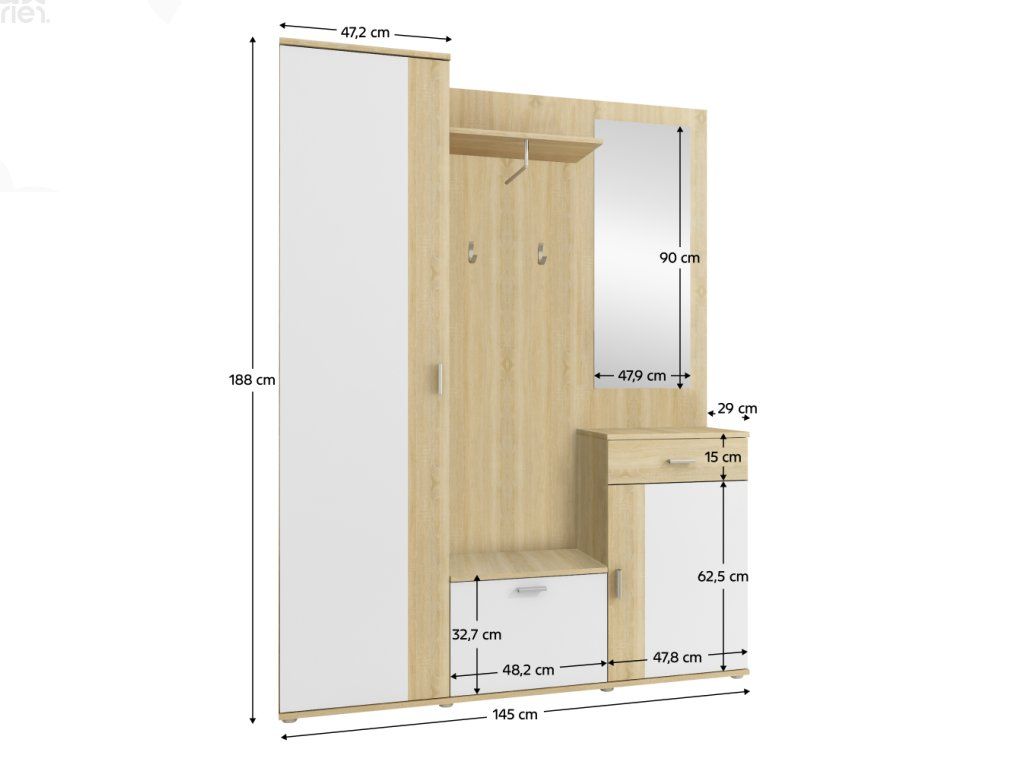 Předsíňová stěna SHIRIN v kombinaci dub sonoma a bílé barvy nabízí moderní a praktické řešení pro každou domácnost. Kompaktní rozměry 144x29x188 cm umožňují maximální využití prostoru v předsíni nebo chodbě, přičemž poskytují dostatek úložného prostoru pro obuv, kabáty a doplňky. Korpus je vyroben z kvalitní DTD laminované desky o tloušťce 16 mm, která zajišťuje odolnost a dlouhou životnost. Produkt je dodáván v demontu, což usnadňuje přepravu a montáž.