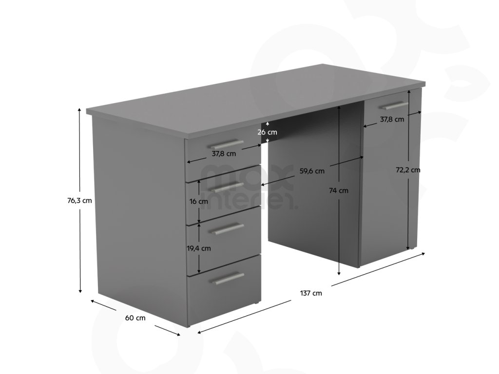 Stůl disponuje prostornou pracovní plochou o rozměrech 137x60x76,3 cm, která poskytuje místo pro počítač, dokumenty i další pracovní pomůcky. Součástí je také praktická sestava úložných prvků – čtyři šuplíky různých hloubek a jedna skříňka. Mělčí šuplíky s výškou 16 cm jsou vhodné pro kancelářské potřeby či dokumenty, hlubší šuplíky s výškou 19,4 cm pak nabízejí prostor i pro objemnější předměty. Skříňka o rozměrech 37,8x60x76,3 cm rozšiřuje možnosti uložení a pomáhá udržet pracovní místo přehledné.
