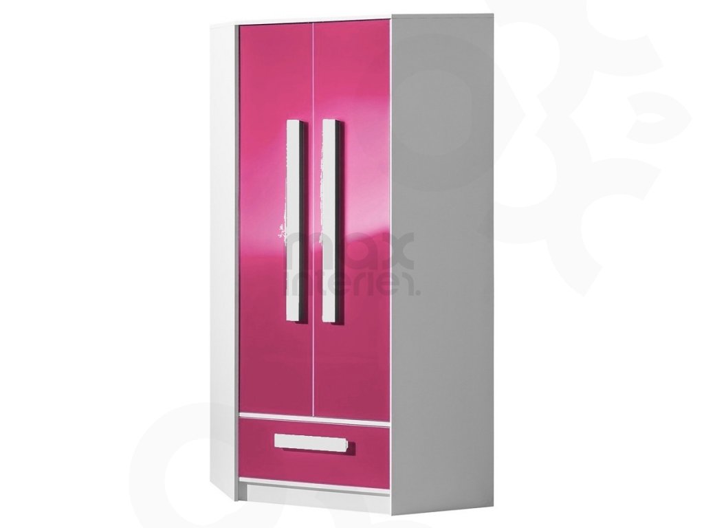 Rohová šatní skříň GALIO 2 do dětského pokoje - bílá / růžový lesk