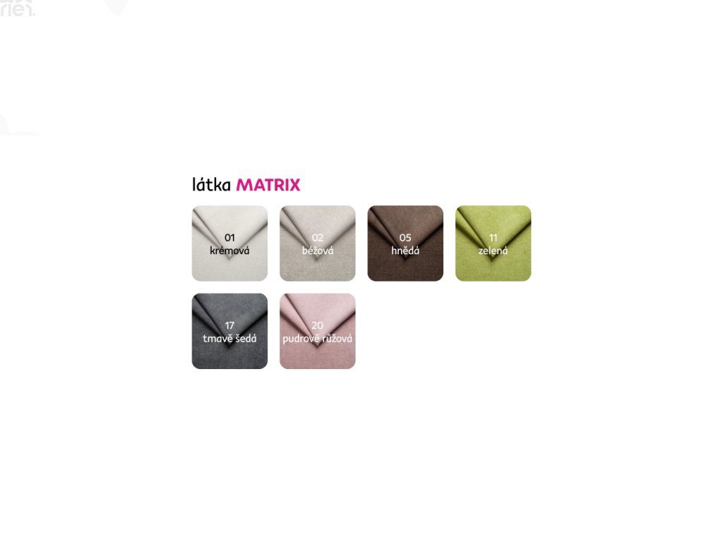 Možnost objednání v 7 barevných provedeních látky Matrix v ceně 8.950 Kč. Při individuální objednávce je třeba zaplatit 10% zálohu z dané částky. Po uhrazení zálohy bude Vaša objednávka zadána do výroby. Doba dodání 6-8 týdnů.